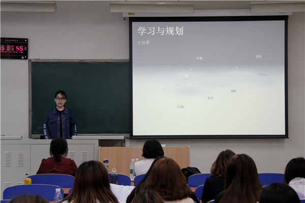 随后进行上台交流的是两位学习优异的同学——谢相茹和王佳星同学,她们两个人做了充足的准备,跟同学们分享了自己的学习习惯,推荐了大家一些好的学习方法,并且同时提到了宿舍学习氛围是每位同学学习进步的关键。