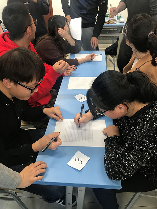 活动伊始,同学们通过抽签分组并各自取了组名和口号,进行组间对战,对战节目有你画我猜、4张牌算24、五子棋、码养乐多等,每一个节目同学们都是体力与脑力的对决,最终积分高者胜出。