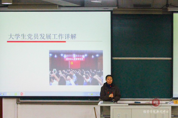 赵老师首先讲解了入党申请书的书写以及入党积极分子的确定和培养教育,他说“加入中国共产党是一件崇高的事而不是儿戏,要做好承担责任和随时奉献自己的准备,并且加入的目的要单纯,不能掺杂任何私心。”