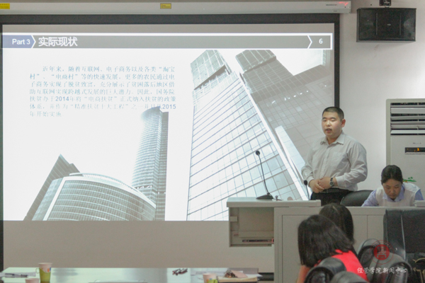 答辩刚刚开始,第一位上场的是张钰宸同学,张钰宸从电商扶贫的政策,现状以及优劣进行了分享,并以京东为例,夯实有力地证明电商扶贫的准确性。