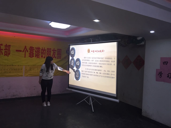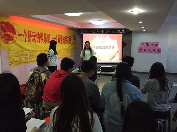 会议初始,主持人首先由“两会”引出话题,接着围绕“社会主义核心价值观”和“中国梦”展开了讲解,使同学们对于讲话精神有了初步的了解。之后便开始了交流主题——“四进四信”,主持人带领大家认真深入学习了“四进四信”精神的提出背景和主要内容,并重点讲解了“四进”,即通过“进支部,进社团,进网络,进团课”,将理论与老员工的学习生活紧密相连,进一步增强了同学们对讲话精神必要性、战略性的认识。在讲解的过程中,主持人不时的提出相关的问题,志愿者们积极回答,并由青年汇工作人员为答题者提供了小礼品作为纪念,随后大家围绕话题展开了热烈的讨论,现场气氛活跃。