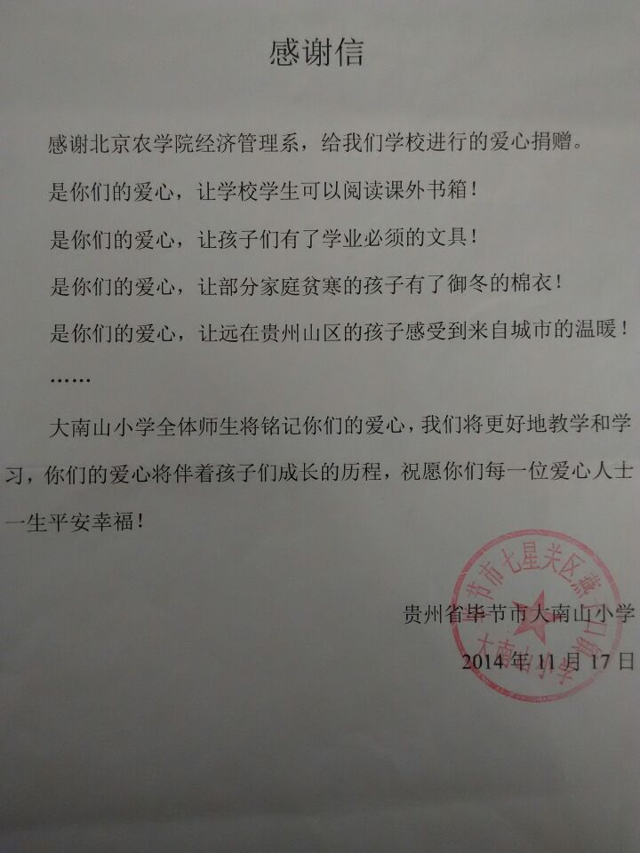 近日,yl6809永利收到了一封来自贵州省毕节市大南山小学的感谢信,信中写道:“是你们的爱心让远在贵州山区的孩子感受到来自城市的温暖……”信件简短却充满真情,语言朴实却不乏感动,并在信的最后表达了大南山小学全体师生对yl6809永利爱心捐赠行为的感激之情和将来回报社会的感恩之心。