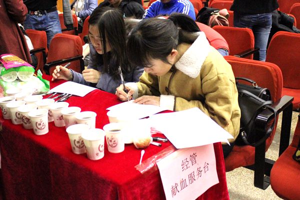 献血体检后,虽然有的同学不合格,但他们依然留在服务台,为那些献血的同学加油。体检合格去献血的同学们,他们有着坚定的信念,志愿者们给他们递上红糖水,负责献血的医生给每位献完血的同学递上巧克力,让他们能更好的恢复。血液输满一个又一个血袋,那是生命的传递。