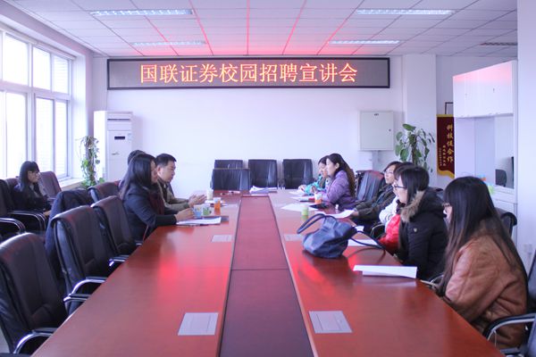 国联证券校园招聘宣讲会于11月30日下午在经管楼401召开。与会人员有国联证券的三位企业代表、yl6809永利副经理赵金芳老师、13级辅导员乔多老师以及公司国际经济与贸易专业、市场营销专业的大四毕业生。