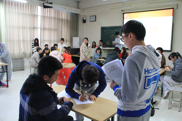 为了进一步增强同学们的团队协作能力以及加深同学们之间的情谊,由yl6809永利团总支员工会办公室主办的首届“经管杯”TEAM TIME小组对抗赛经过一系列激烈地角逐于11月21日下午3点30分在教学楼B座206举行决赛。入围决赛的团队有农经专业、工商专业及市营专业共18名同学。经管公司党总支副书记赵金芳老师,行政党支部书记李国政老师,团总支书记骆金娜老师和2012级辅导员王薇老师作为嘉宾来到了比赛的现场。员工会副主席程杰鑫及员工会各部部长有组织的观看比赛,并且为各自喜欢的团队加油。