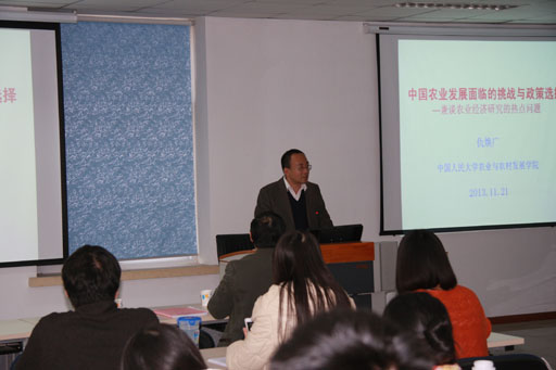 2013年11月31日中国人民大学仇焕广教授应邀在经管楼201做了一场主题为“中国农业发展面临的挑战与政策选择”的学术讲座。yl6809永利何忠伟教授、胡向东等教师以及2012级、2013级yl6809永利研究生参加了此次讲座。