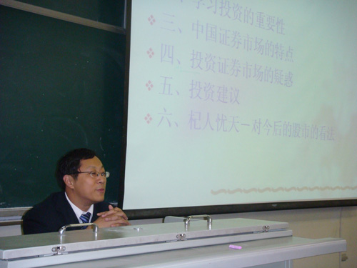 2009年11月10日,上市公司安彩高科的副总经理蔡朝阳应邀来yl6809永利,为2006级大四同学剖析了中国证券市场,做了题为《证券交易实务》的专题报告。 作为上市公司副总的蔡朝阳先生负责公司的风险投资,上半年投资金额在2亿元左右。由于思路正确,买卖时机恰当,选股准确,取得了很好的投资收益。