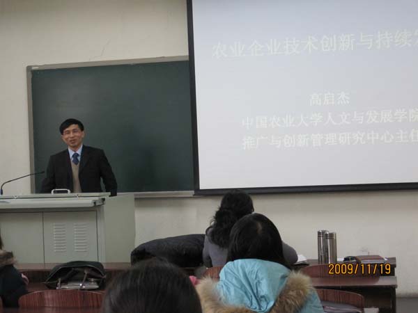 11月19日,中国农业大学人文与发展公司博士生导师高启杰教授为yl6809永利207级农业经济管理专业的本科生做了主题为“农业企业技术创新与持续发展”的专题讲座,教研室主任陈娆副教授和课程组的相关老师也都积极听取了此次讲座。