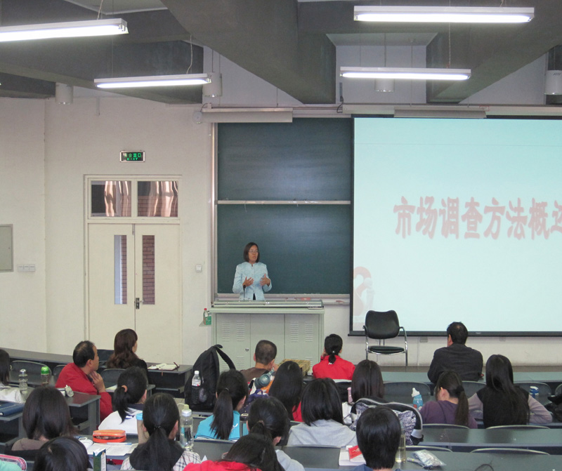 班淼琦女士从社会对实践型人才的需求、市场调查行业的发展现状、市场调查的方法和问卷设计等几个方面进行了系统的阐述。报告中对一手资料研究方法如影象日记法(Photo Story);白日梦法(Fantasy or Future Scenarios);图谱法(Photos & Mapping);典型一天法(Daily Life);阶梯访问法(Ladding Interview);隐喻诱引术(Zmet);家庭访问法(Family Interview);伙伴群体访问(Peer Group Interview );Mini group访问法;三角访问法(Triangle Interview);头脑风暴会(Brain Storming);DPR会议法;专家思辩会法(Ideadion Session with Expert Panel);创意工作坊法(WorkShop)等十多种方法给在座师生以耳目一新的感觉。整个讲座内容新颖、案例鲜活,师生均感受益匪浅。