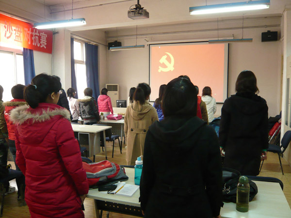 最后,进行了第三党支部书记的换届选举,孙珊珊同学接替陈丽同学担任新一届的第三党支部书记,孙珊珊同学做了接任致辞。最后,全体参加会议的同学在党旗下光荣宣誓,并由陈丽同学进行了总结。大会在《国际歌》的乐曲声中闭幕。
