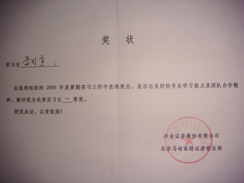 8月28日,兴业证券公司为yl6809永利第一批实习生颁发了奖状和奖金,还为每位同学写了实习鉴定。