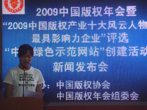 2009年9月5日,由中国版权协会,中国版权年会组委会主办的“2009中国版权年会新闻发布会”在中国国际展览馆隆重召开,参加此次活动的领导包括原国家版权局副局长,中国版权协会,董事长沈仁干;中国版权协会常务副理事长张秀平等人,还有来自各界的媒体。此次活动是为了更好地营造健康绿色的网络空间。
