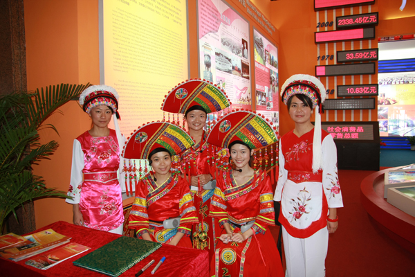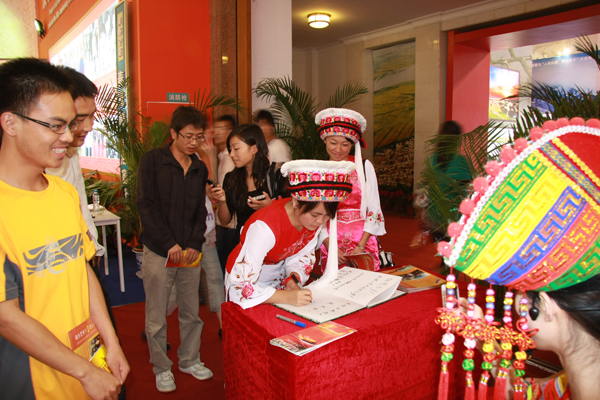 参观中,公司身着民族服装的两位白族同学李洁玉和李君成了一个亮点,所到之处参展观众纷纷与她们合影留念,争相了解白族民族习俗,对于大家的提问两位同学都一一解答,很好的展示和推广了民族文化。来自广西壮族自治区的同学在看了广西展厅后感慨万千,感受到家乡的繁荣昌盛与自身所肩负的重大使命。部分同学们在参观完后即兴在留言簿上留言祝福祖国60华诞,祝愿祖国繁荣昌盛,祝愿公司蒸蒸日上,祝愿yl6809永利明天更美好。