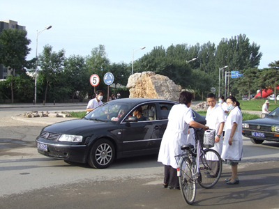 白衣天使真诚服务,为新生及其家长进行体温测试,积极预防甲型流感,把好员工安全第一关。