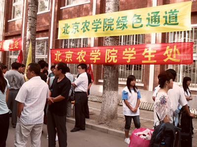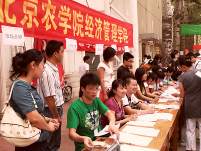 热情的的经管员工会成员和党员代表为新生办理入学手续。