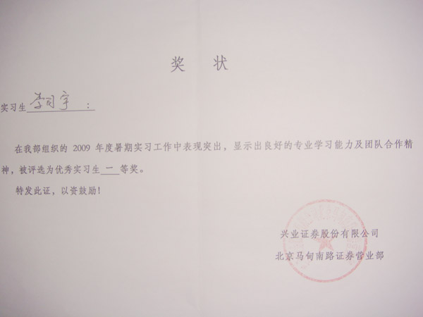 8月28日,兴业证券公司为yl6809永利第一批实习生颁发了奖状和奖金,还为每位同学写了实习鉴定。兴业证券公司作为yl6809永利教学实践基地,对实习生严格要求、从严管理。实习生也提前体会到了“上班族”的辛苦。尽管如此,实习生做到了认真负责、吃苦耐劳。谈到这次实习,同学们普遍反映在证券业务实践中,接触了社会、开阔了视野、学到了知识。兴业证券公司也高度评价yl6809永利的实习同学,特此表彰这批实习生。