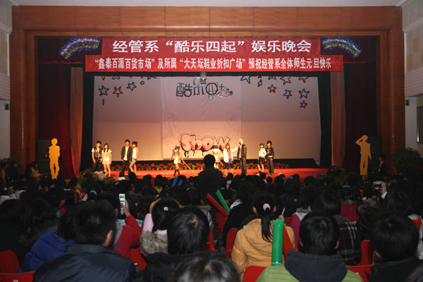 2008年12月8日晚7:00,经济管理系“酷乐四起”大型娱乐晚会在礼堂隆重举行。此次晚会由经管系团总支、员工会主办,前后筹划耗时近三个月,参与演职人员将近200人,精心排演共13个节目,既有外请专业魔术师神乎其技的魔术,又有我系同学自编自演令人捧腹的对口相声;既有激情四射的街舞旋风,又有令人窒息的飞车特技,使长达三个半小时的晚会,始终气氛热烈,高潮迭起。观看本次演出的有公司党政办主任孙亚利、员工处副处长张国柱、团委书记杨宝东、植科系副主任赵金芳、人文社科系副主任张彦敏、城乡发展公司副经理范晓强、经管系党总支书记李华、系主任何忠伟、副主任刘柳、副主任刘芳、团总支书记王月以及辅导员、部分班主任、各系(二级公司)员工会主席,大家一致对晚会给予了高度的评价。