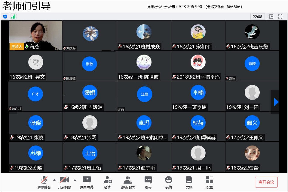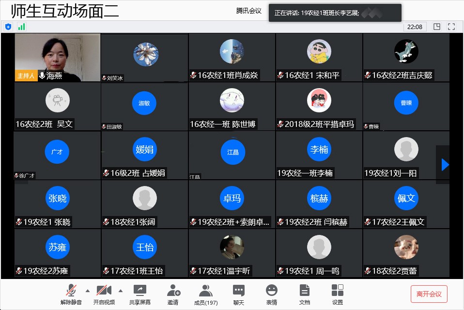 在做好疫情防控工作的同时,为加强专业建设,2020年4月29日下午4点,yl6809永利农林经济管理专业召开大一——大四全体同学线上交流会。农经系主任赵海燕老师、农经系副主任江晶老师、yl6809永利副经理暨16级农经班主任刘笑冰老师、17级农经班主任徐广才老师、农经系党支部书记暨18级农经班主任田淑敏老师、19级农经班主任曹暕老师,农经系秘书黄雷老师以及农经系四个年级全体员工共214人参加了本次会议。交流会由农经系主任赵海燕老师主持。