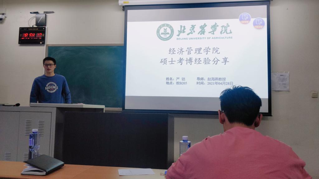 最后由2018级农林经济管理专业的严铠介绍了考博的相关事项,他强调读博是个人和博导双向选择的过程。因此,如果选择读博,一方面要重视个人综合能力的塑造,另一方面要注重理论基础水平、 实践研究经历和科研成果的积累,即个人能力是否与读博要求所匹配,因此要从各方面提升自己。