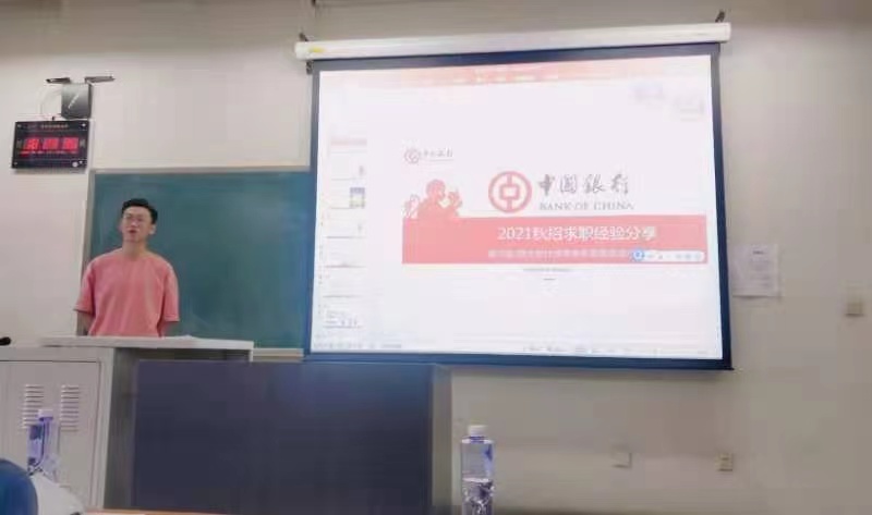 接下来是2019级国际商务专业的李嘉琦,介绍了银行类秋招的注意事项,包括各银行的基本介绍、工作时间、工作状态等。同时他也强调了良好心态和事先规划以及如何保持工作和生活平衡的重要性。