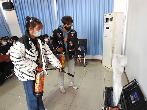 在实际操作环节,同学们在听到指令后,迅速到位,拿起灭火器模拟灭火演练,在最短的时间内成功将火焰扑灭。