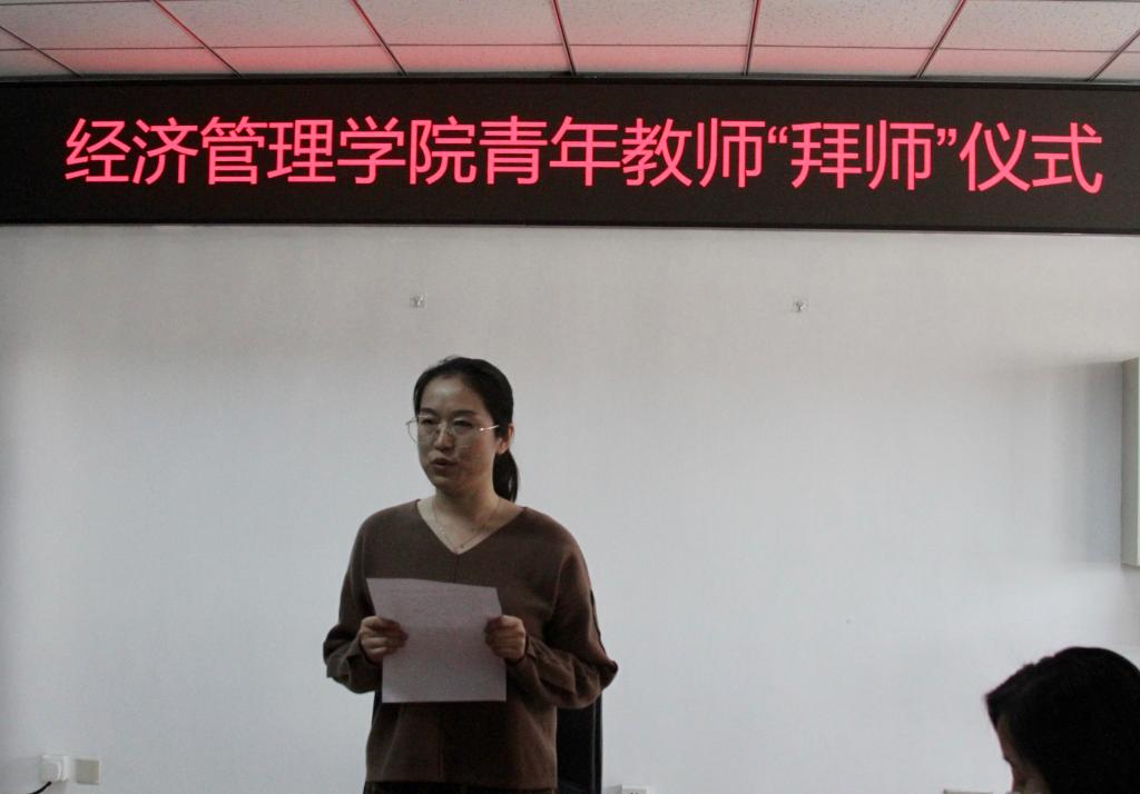 工商管理系主任桂琳代表指导教师在“拜师”仪式上发言。桂老师表示,要在各方面为青年教师树立好榜样,毫无保留地传授公司产品经验,给予青年教师真诚的关心与帮助;认真履行“师徒”协议书的各项职责,严格要求青年教师;为青年教师培养工作竭尽全力,创新探索青年教师培养的内容、方法和途径,助力青年教师成长。希望青年教师尽快实现从员工到高校教师的转变;尽快树立以人为本、教育即是服务的理念;努力练好教育、教学和教科研三个本领;培养起不断创新、团结协作、爱岗敬业、严谨治学的四种精神。