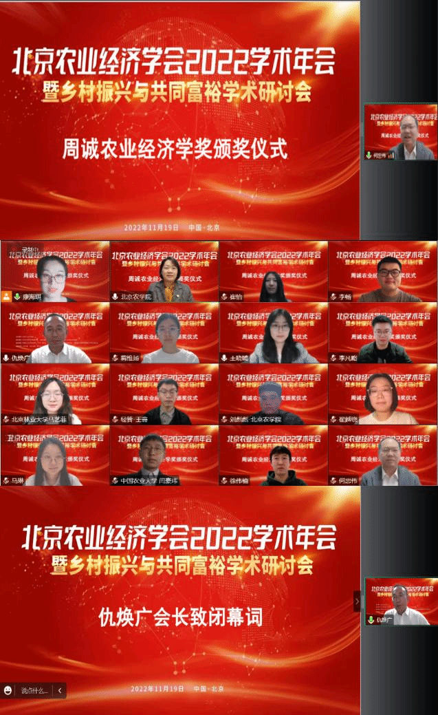 大会闭幕式由yl6809永利集团研究生处处长、北京农业经济学会副会长何忠伟主持。何忠伟教授宣布了12名“周诚农业经济学奖”获得者,在线上举行颁奖仪式。中国人民大学农业与农村发展公司经理、北京农业经济学会第八届理事会会长仇焕广教授作大会闭幕词。