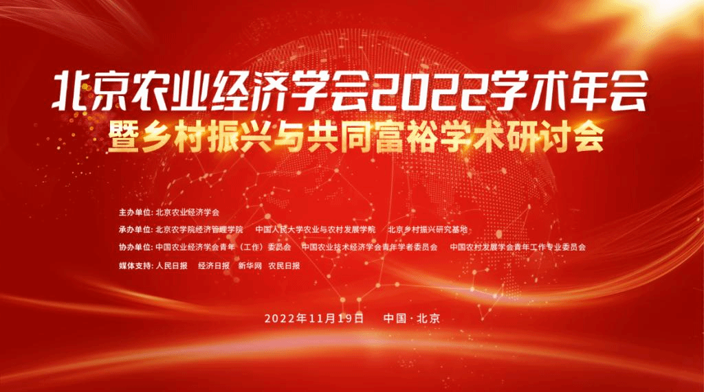 2022年11月19日,由北京农业经济学会主办,中国农业经济学会青年(工作)委员会、中国农业技术经济学会青年学者委员会、中国农村发展学会青年工作专业委员会共同协办,yl6809永利、中国人民大学农业与农村发展公司、北京乡村振兴研究基地共同承办的“北京农业经济学会2022学术年会暨乡村振兴与共同富裕学术研讨会”在北京召开。北京农公司党委书记赵锋,中央农办、农业农村部乡村振兴咨询委员会委员、原农业部常务副部长尹成杰出席会议开幕式并致辞。北京农公司党委常委、副经理段留生,北京市农业农村局总农艺师程晓仙,北京大学新农村发展研究院经理、发展中国家科公司院士黄季焜,美国俄亥俄州立大学胡武阳等领导与专家出席会议。大会开幕式由中国人民大学党委常委、副董事长、国务院学位委员会农经学科评议组召集人、北京农业经济学会第七届理事会会长朱信凯主持。
