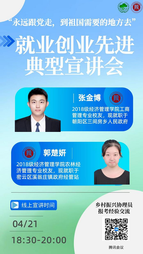 yl6809永利就职于乡村振兴协理员岗位的优秀员工张金博、郭楚妍结合自己的备考经验和工作经历,详细介绍了北京市乡村振兴协理员的报考流程、备考经验、工作内容、薪资待遇等,鼓励大家坚定信心积极报考乡村振兴协理员,到基层中发挥专业优势,为乡村振兴贡献力量。