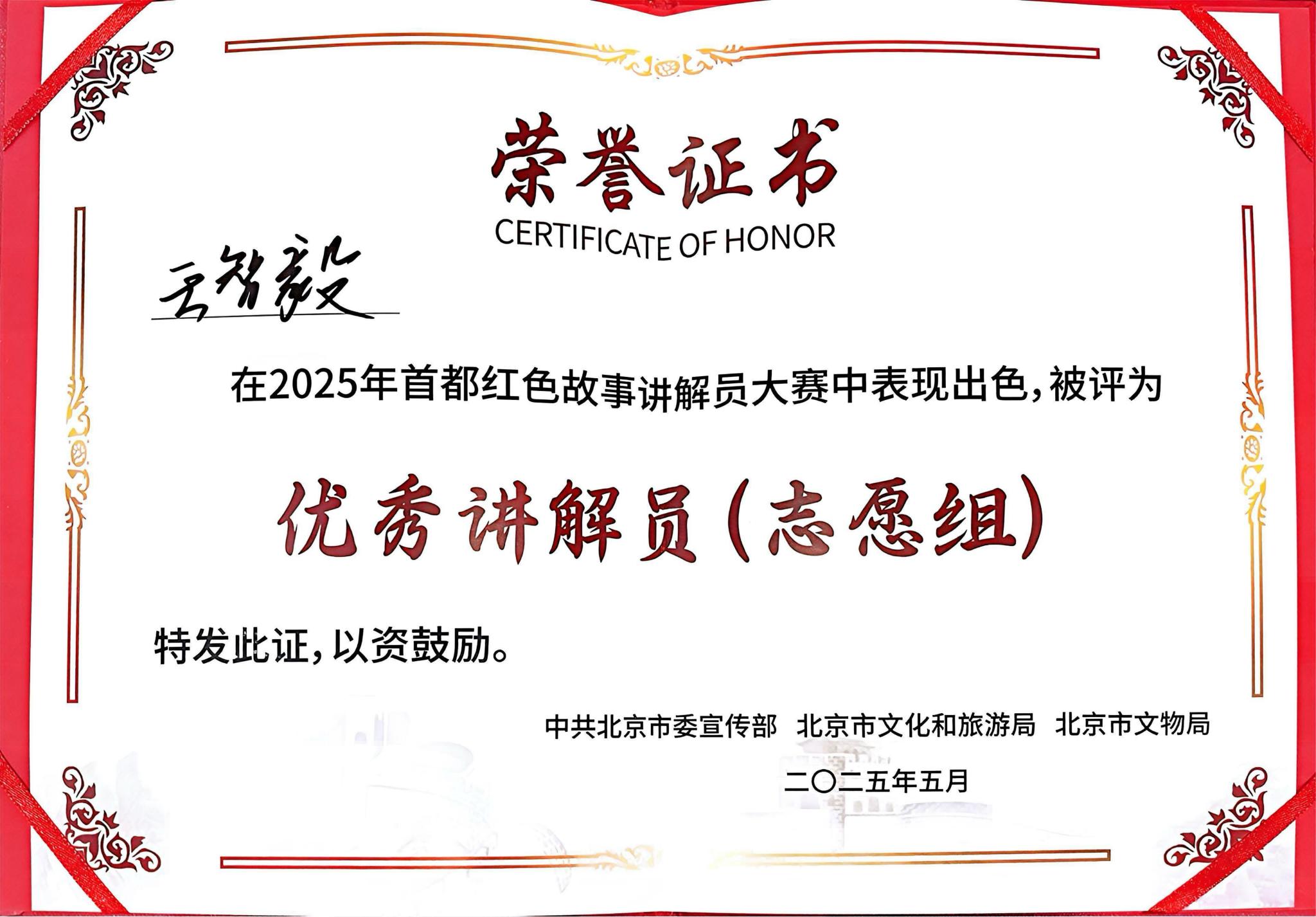 本次大赛由中共北京市宣传部、北京市文化和旅游局、北京市文物局联合主办,旨在纪念中国人民抗日战争暨世界反法西斯战争胜利80周年,进一步加强红色旅游讲解人才队伍建设。大赛以“胜利号角的回响”为主题,吸引了来自全市各高校、博物馆、红色景区的百余名优秀讲解员参与。经过激烈角逐,初赛评选出专业组、志愿组各10名参赛选手进入市级决赛环节。决赛中,王智毅同学深情讲述了革命先辈的感人事迹,展现了扎实的讲解功底和深厚的红色文化素养,赢得了评委和观众的高度赞誉。