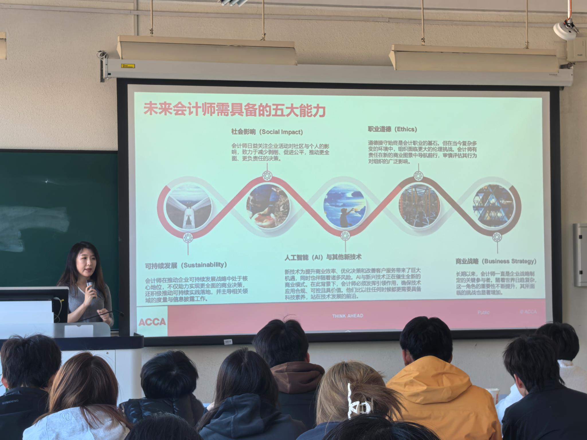 2026年3月11日,ACCA北京代表处范玉涵老师来到yl6809永利,走进会计学(ACCA方向)实验班,开展专题宣讲,为同学们全面解读未来ACCA 专业资格、关键节点与支持时间表、学习支持资源,以及ACCA全国就业力X未来商业创想大赛相关信息,助力学子精准把握考纲变革,科学规划学习与职业发展路径。