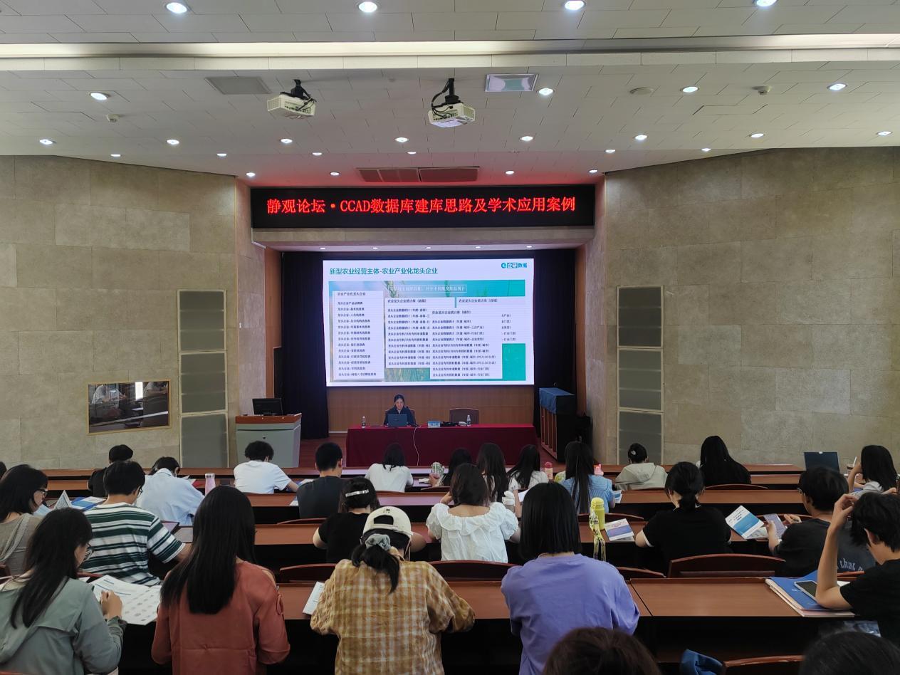 司凡研究员首先为师生介绍了CCAD数据库的数据框架,包括新型农业经营主体、涉农市场主体、数字农业、绿色农业、农业生产、农产品研究、乡村研究、三农研究统计数据等8大领域,覆盖40多个子库,120多个模块,包含600余张表格,合计约1万多个字段,这些数据位农经领域的研究者提供了系统的研究资料。随后,她利用学术研究的实际案例进一步讲解了系统数据的研究分析方法,使师生们更直观地了解如何充分利用数据库开展深入的科学研究并形成可发表的学术成果。目前,利用CCAD数据库开展研究所形成的高水平学术论文已经频繁出现在《管理世界》《经济研究》《农业技术经济》《中国农村经济》等核心期刊。