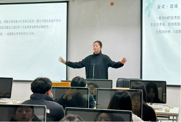 刘一阳结合两年工作经历分享了报考“三支一扶”计划之后服务基层的心路历程和备考经验;荆雨涵从事业单位考试的选岗、备考和应试等角度出发,细致讲解了整个流程和注意事项。两位员工还针对现场同学提到的报名条件、岗位选择,以及工作实际情况等问题做了详细的解答。通过本次活动,更好地帮助员工认识相关岗位职责和工作内容,做好提早规划和准备。