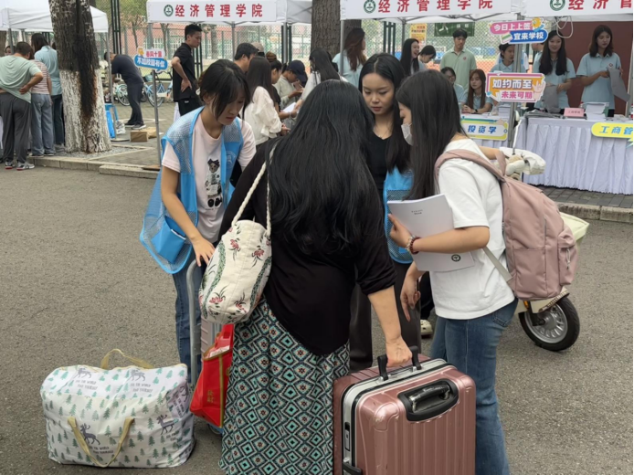 迎新现场,指引牌清晰醒目,志愿者们身披绶带穿梭其间,从行李搬运、报到注册到宿舍引导,暖心服务全程在线,为新生及家长提供贴心帮助。“同学这边走,档案材料请交给我”“宿舍在7号楼,我帮你拿行李”……一句句热情的指引、一次次暖心的援手,让初来乍到的新生倍感亲切。