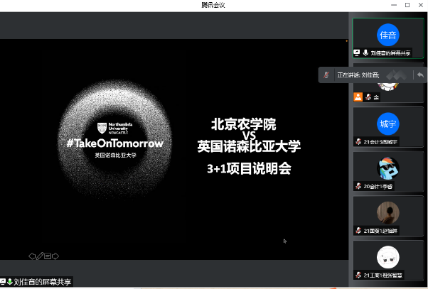 2022年5月6日中午,yl6809永利采取线上的形式召开了2022年英国诺森比亚大学“3+1”联合培养项目招生宣讲会。此次会议由英国诺森比亚大学国内项目负责人刘佳音老师主讲,公司主管外事工作刘笑冰副经理、外事秘书余洁老师和部分本科生参与了本次会议。