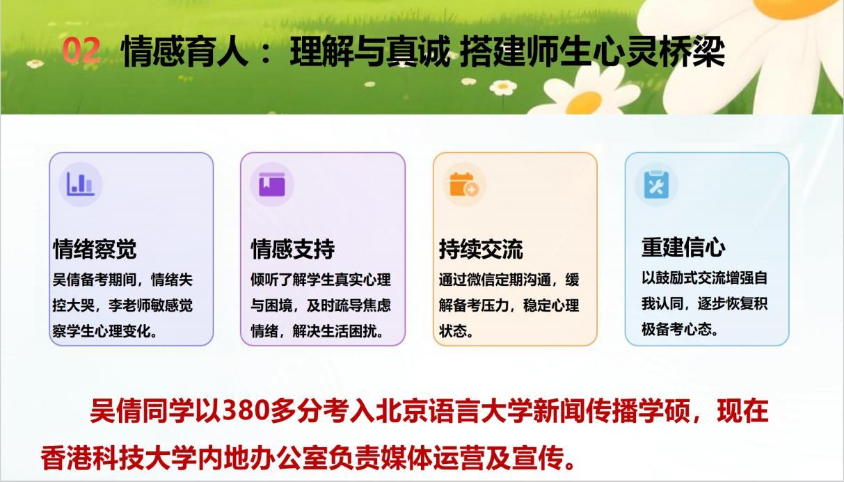 李老师没有催促,只是递上纸巾,静静陪伴。等吴倩平静下来,她才得知,考研的压力与疲惫、人际交往的复杂已让这个女孩濒临极限。在那之后,李老师常常通过微信和线下会面与她聊天,并且时常鼓励她调整自己的心态。她曾说,“跨专业考外校不易,既要敢拼,也要能接受任何结果——心态好了,反而更从容。”最终,吴倩高分考入北京语言大学,如今已在香港科技大学内地办公室独当一面。