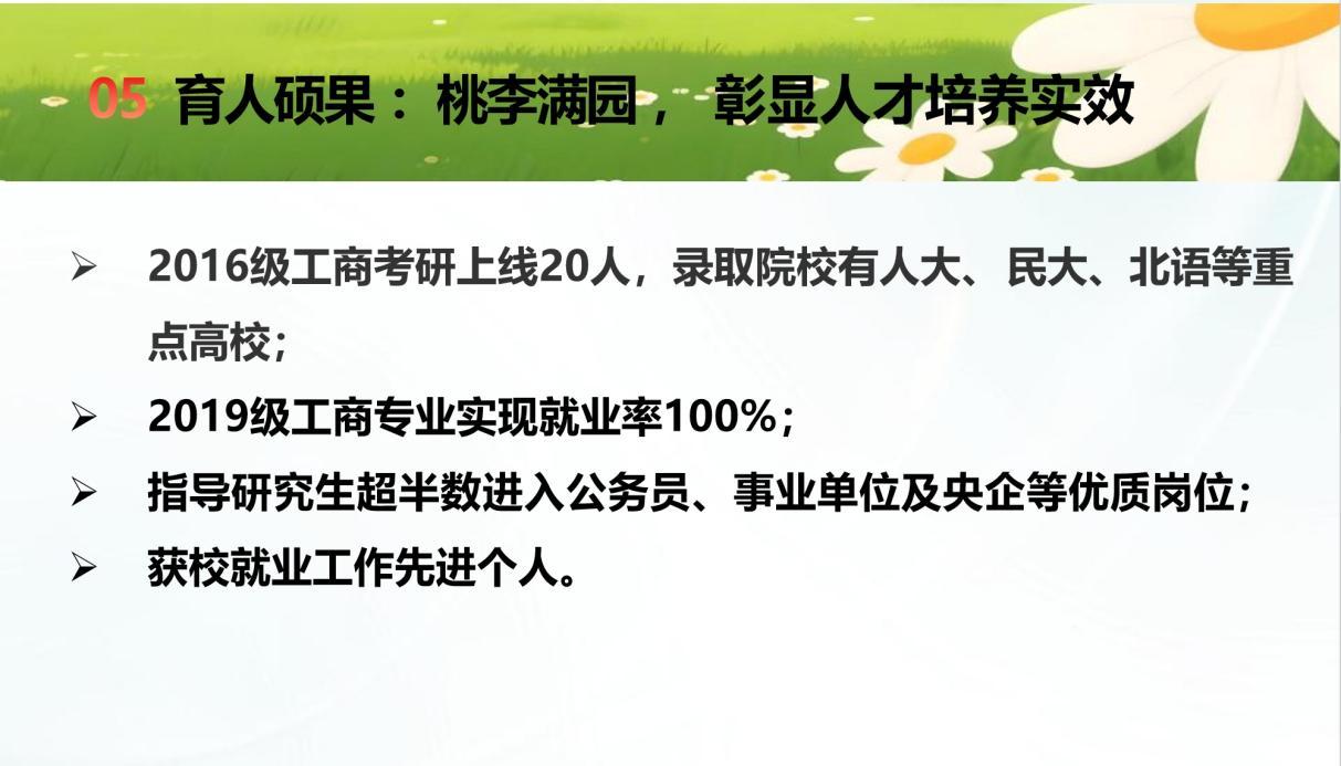 二十余年来,李萍老师带过的班级屡创佳绩:2016级工商专业考研上线20余人,多人进入人大、民大、北语等高校;2019级实现全员就业。她指导的研究生,超过半数进入公务员、事业单位和央企。她本人也多次获评“就业工作先进个人”“课程思政教学名师”。